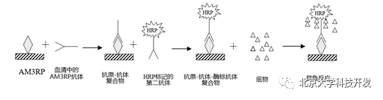将AM3RP包被于酶联免疫吸附微孔板上,与待测血清一起孵育,如果血清中存在抗AM3RP抗体,该抗体会与包被的固相抗原结合,形成抗原-抗体复合物。将未结合的抗体及其它成分冲洗干净后,加入辣根过氧化物酶(HRP)标记的羊抗人IgG抗体(IgG-HRP)一起孵育,此时IgG-HRP与抗原-抗体复合物结合,形成抗原-抗体-酶标抗体复合物,洗去未结合的成分,加入底物,若血清中含有抗AM3RP抗体,则会显出特定的颜色,且抗体滴度越高颜色越深。加终止液后在450nm波长下测定OD值,根据标准曲线可计算出待检样本的抗AM3RP抗体浓度。