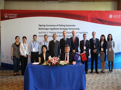 2017年5月16日,北京大学-勃林格殷格翰战略合作伙伴协议签署仪式暨北京大学-勃林格殷格翰第一届转化研究论坛在北京大学博雅国际会议中心举行。北京大学副校长王杰和勃林格殷格翰公司早期研究高级副总裁Clive R. Wood博士出席签约仪式。北京大学-勃林格殷格翰战略伙伴关系旨在共同推动早期科学创新,填补肿瘤、肿瘤免疫和免疫调节、呼吸系统、心血管代谢及中枢神经系统疾病等领域内的医疗需求。该战略伙伴合作关系包含多种合作形式,包括以具体科研项目为基础的共同研究、博士后奖学金及BI讲席研究员。北京大学研究团队将与勃林格殷格翰内部研究人员紧密合作,利用各自在制药研发领域的专长,通过创新研究方法及洞见,在公司核心治疗领域以及其它治疗领域找到创新靶点和药物。勃林格殷格翰希望通过该项合作,带来更多具有突破性潜力、同类第一的新药,将勃林格殷格翰在亚洲的研发带入一个新的水平。