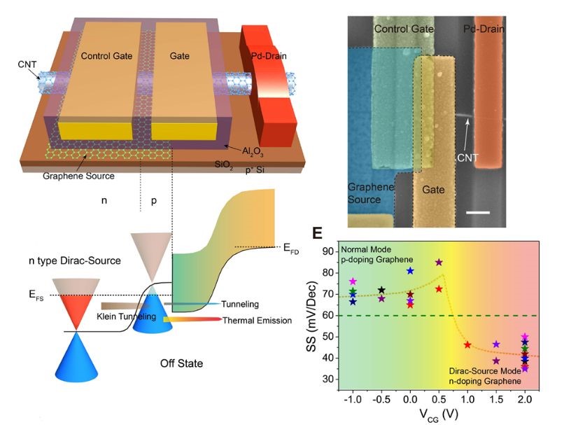 从2001年开始,北京大学团队在国家“973”计划、重大科学研究计划和国家重点研发计划项目,国家基金委创新研究团队和北京市科委连续6年的支持下,在碳基电子器件相关材料和制备工艺的研究中取得一系列突破性进展,发展了一整套碳纳米管CMOS集成电路和光电器件的无掺杂制备新技术。该技术的核心为放弃掺杂,通过控制电极材料达到选择性地向晶体管注入电子或空穴,实现晶体管极性的控制。团队首次实现了5纳米栅长的碳纳米管CMOS晶体管,由此证明了在亚10nm的技术节点,碳纳米管晶体管在性能和功耗综合指标上较最先进的硅基CMOS器件具有10倍以上的优势,并接近由量子测不准原理决定的电子器件理论极限(Science,2017, 355:271)。此外,团队发展并采用在完整硅晶片或标准显示玻璃面板上规模制备高纯碳纳米管薄膜技术,制备出速度达到单晶硅水平的5.54GHz环振电路(Nature Electronics, 2018, 1:40)和中等规模的高性能碳基CMOS集成电路(ACS Nano, 2017, 11:4124)。2018年,团队针对功耗已经成为当今集成电路的发展的瓶颈现状,重新审视了传统晶体管功耗的物理极限,提出并制备了一种新型超低功耗晶体管—狄拉克源晶体管(Science 2018,361:387),该技术采用具有特定掺杂的狄拉克半金属(石墨烯)作为源端,实现了超越常规金属和半导体的“冷”电子源,大幅降低了传统晶体管工作所需驱动电压,为超低功耗纳米电子学的发展奠定了基础,极大推进了碳纳米管集成电路的竞争力和实用化发展。