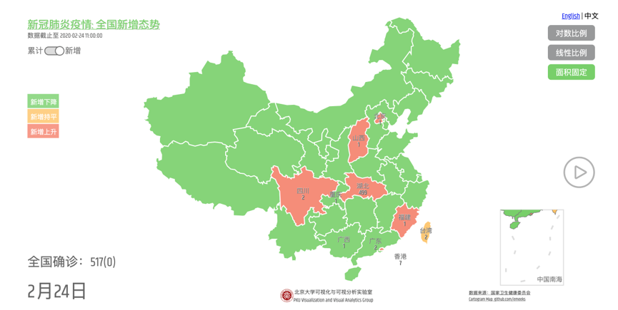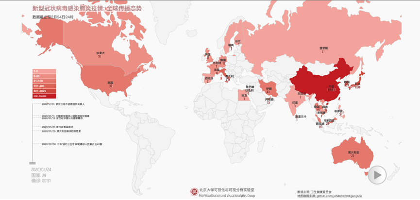 北京大学信息学院机器感知与智能教育部重点实验室袁晓如研究组设计开发了一系列大数据可视化与可视分析工具。针对目前在新冠疫情方面形势变化,通过处理、分析、接入多种数据,提供多维度、多视角的交互式可视化。