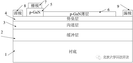 目前已经申请了中国专利以及美国专利。下图是本发明第一种实例涉及的GaN器件的截面图,如图所示,本器件包含外延所需的衬底1,可以采用硅衬底、蓝宝石衬底和碳化硅衬底;能平衡外延过程中应力、降低器件漏电流、提高击穿电压的缓冲层2;提供导电沟道的GaN沟道层3;通过极化效应产生二维电子气的AlGaN势垒层4;耗尽二维电子气的p-GaN帽层5;用于屏蔽势垒层表面陷阱和通过空穴注入复合缓冲层中负电中心的p-GaN薄层6;栅极7、漏极8、源极9等接触电极,其中源极和漏极采用欧姆接触分别制备在器件两端,栅极制备于p-GaN帽层上。