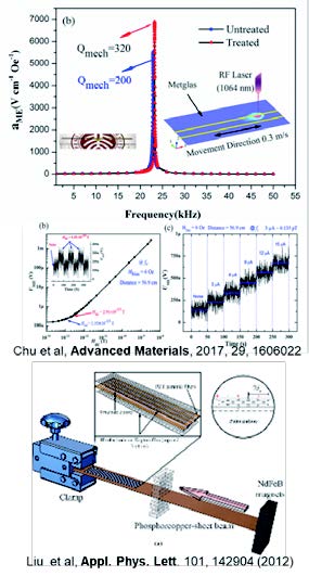 北京大学工学院实验室通过激光处理压磁材料FeBSi合金(Metglas),提出了1-1型的磁电复合结构。实验测试得出:1-1型磁电材料具有超高的磁电系数(超过7000 V/cm Oe),相比于现有结果提高了接近7倍。当被测磁场频率为复合材料的谐振频率时,在室温条件下测到了1.35×〖10〗^(-13)Tesla的微弱磁场,这是块体磁电复合材料领域的重要突破。该研究还发现,激光快速退火处理可以显著降低压磁材料在谐振频率点的交流损耗,从而提高1-1型磁电结构的机械品质因子。此外,1维(1D)的结构也有利于降低退磁因子,并增强磁通聚集效应。