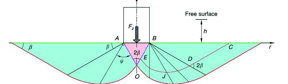 刚性介入体压入过程中形成的颗粒材料固化区(粉红色三角形AOB)以及流化区(绿色部分)