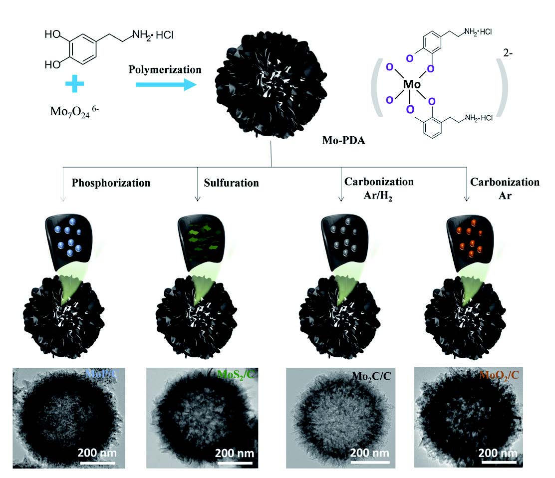 目前的工作首先是制备具有多级空心结构的钼基金属螯合物,通过煅烧原位转化的方法制备一系列钼基化合物(包括MoP,MoS2, Mo2C和MoO2)与碳空心基底之间具有强耦合相互作用的杂化材料。多级碳空心结构(HCSs)具有较大的表面积,优异的导电性及结构稳定性等特点,成为最佳的复合材料基底。通过原位转化得到的超小钼基活性材料与碳空心基底材料强烈耦合,有效提高材料的导电性和稳定性。电催化产氢测试表明MoP@HCSs在酸性溶液和碱性溶液中均具有优异的析氢反应活性和稳定性。另外研究发现,MoS2/CHCSs作为钠离子电池负极材料,表现出优异的电化学性能。在4 A/g电流密度进行充/放电循环1000圈, 其容量依旧高达410 mAh/g。这种独特的碳纳米片上生长MoS2纳米片结构可以缩短离子传输路径,多级碳空 心结构有效提高电子传输性能和缓解充放电过程中应力的变化,同时这种强相互耦合作用可以避免MoS2纳米片层结构的团聚,有效提高电极材料的倍率性能和循环寿命。
