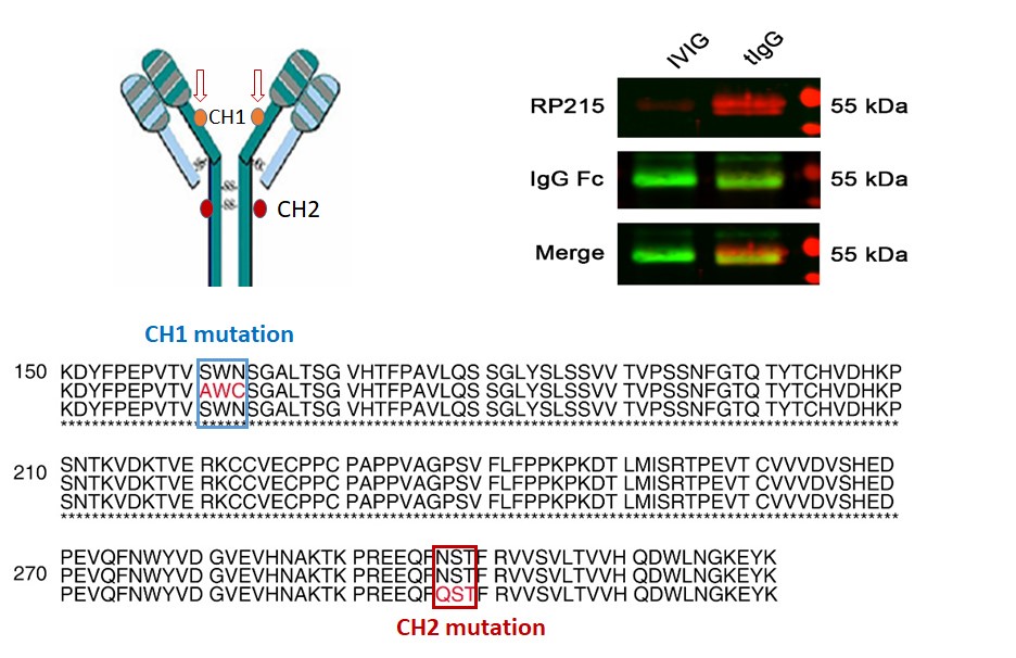 图1. 肿瘤来源的IgG在CH1上一个新发现的N糖基化位点发生唾液酸化(除了经典的CH2位点,左上及下图),用该位点特异性抗体发现CH1上唾液酸修饰主要存在肿瘤组织中,很少在正常人外周血IgG(IVIG)(右上)。