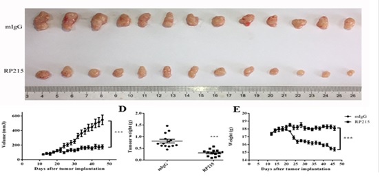 图4 特异性识别CH1位点唾液酸修饰表位的单抗RP215可明显地抑制肺鳞状上皮癌患者获得的癌细胞(PDX模型)在免疫缺陷小鼠体内的生长,而作为对照的正常小鼠IgG(mIgG)没有抑制作用。