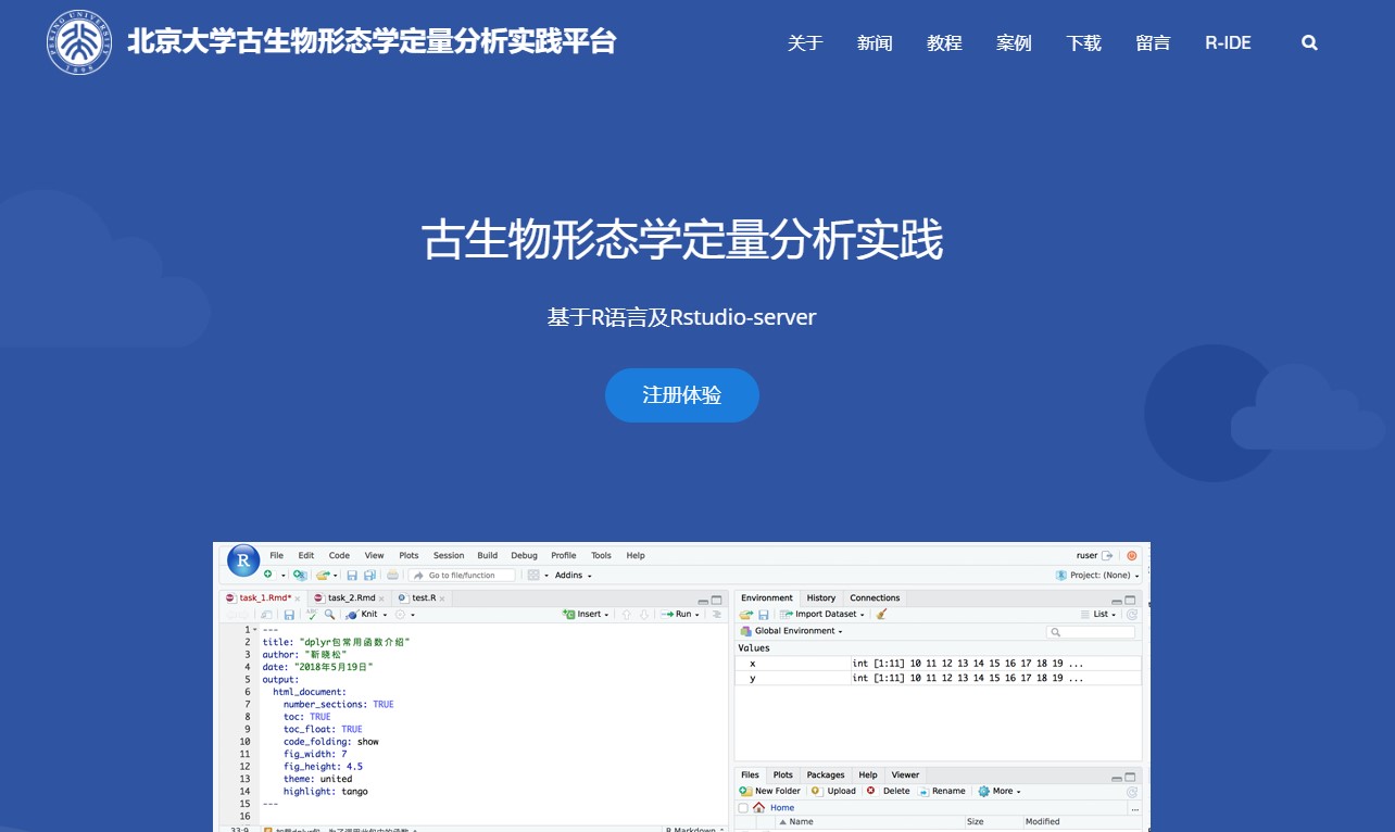 2、基于R语言的古生物大数据分析算法结合实验教学需求,利用R语言实现了大数据分析算法在古生物数据分析中的应用,并整理为完整的实验案例教程,改善了传统古生物实验教学中使用PAST/Excel等工具的实验技术。3、古生物实验教学标准数据集建设了一套涵盖形态学、分类学、古生态学及地层学数据的古生物定量分析标准数据集,同时将线下古生物标本数字化后共享到线上平台。平台特色1、首次建设基于R语言的古生物数据实践平台。国内目前尚无公开采用R语言进行古生物学实验教学的案例。团队首次开发完成了古生物形态学定量分析实践平台,通过云平台计算功能,将R语言编辑器、原始数据、源代码、案例教程等资源和算力都部署在服务器上,师生通过平台即可完成从案例学习到数据计算、处理、可视化及返回数据分析报告的所有流程,实现了实验教学的多人协同工作。创造性的改善了传统古生物学数据分析实验手段,大幅提升了实验教学质量。2、自主研发了R-IDE Server同步共享功能。通过开源软件RStudio-Server和Git软件自主研发了R-IDE Server同步共享功能,实现了云平台中不同用户数据即时同步更新、共享协助功能,节省了大量付费软件购买费用。3、研制了一套古生物实践教学标准数据集。缺少合适的数据集是古生物数据分析实验教学的痛点,团队通过自主生产、公开文献获取、开源数据库下载等方式生成了一套覆盖面完整、格式规范的古生物形态学实践教学数据集。